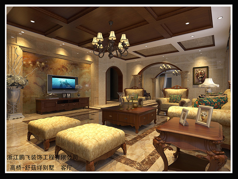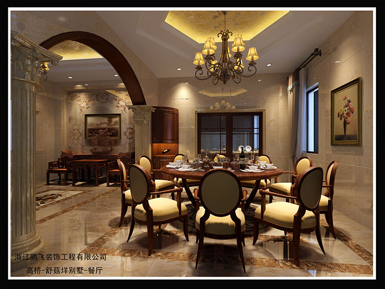 在設(shè)計(jì)上,墻面大面積的使用了古典歐式色彩的壁紙配合經(jīng)過提煉的歐式線條,使歐式不再是遙遠(yuǎn)的過去,而是鮮活時尚的品味象征。減掉了復(fù)雜的歐式護(hù)墻板使用了提煉過的石膏線勾勒出線框,把護(hù)墻板的形式簡化到極致。地面采用石材拼花,用石材天然的紋理和自然的色彩來修飾人工的痕跡。使客廳和餐廳的那種奢華、檔次和品位毫無保留地流淌。